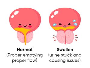 The prostate is a small gland in all men from birth. However, as men age, it can begin to swell and then press on the urinary tube, thereby blocking the free flow of urine.